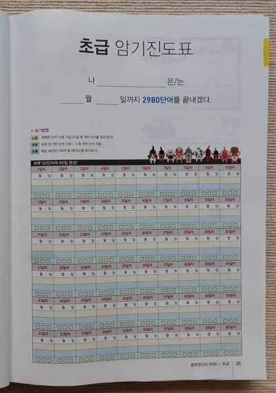 「중학영단어 9000」의 가장 큰 특징은 암기는 어떻게? 복습은 어떻게? 해야 하는지에 대한 구체적인 방법을 제시해 준다는 점입니다. 서약문을 작성하고 파트별로 암기진도표를 작성할 수 있어 공부에 대한 의욕이 생기게 하고, 에빙하우스의 원리를 통해 복습의 중요성을 일깨워 주네요.